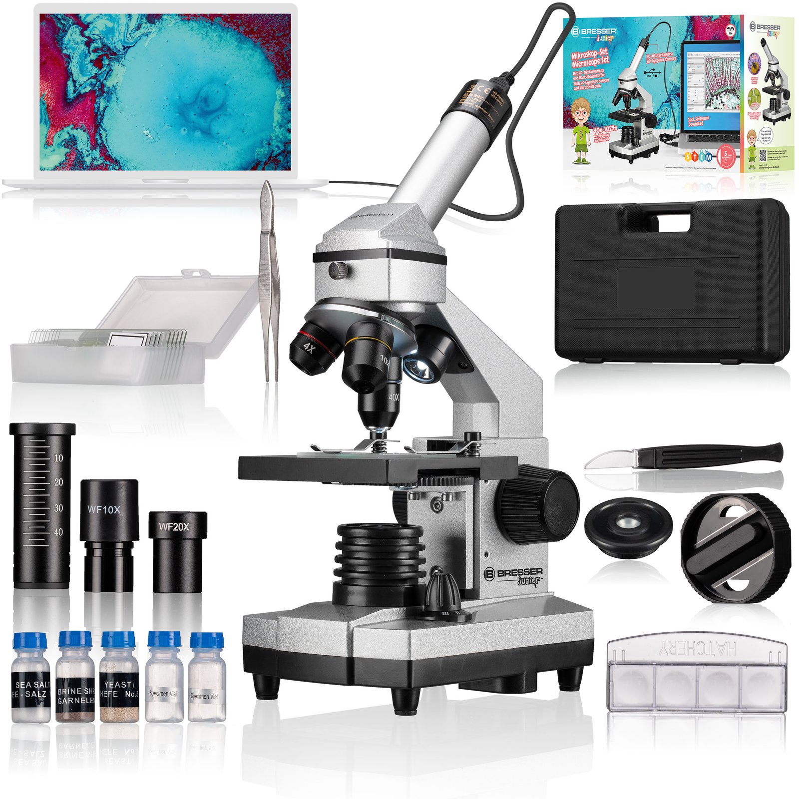 Mais do que um microscópio clássico – o BRESSER JUNIOR 40x–1024x com mala