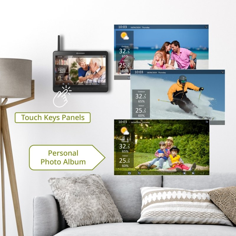 O que torna esta estação única? A função de moldura digital integrada permite transformar o ecrã numa galeria de fotos. Com a app dedicada, pode carregar imagens para a base e desfrutar de um slideshow automático das suas memórias juntamente com os dados meteorológicos em tempo real. Ideal para cozinha, sala ou escritório.