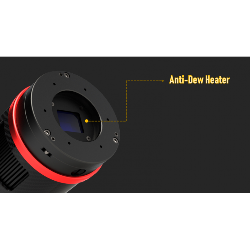 O problema da condensação é um dos maiores inimigos na astrofotografia. Para o combater, a câmara integra um aquecedor anti-condensação na parte frontal, com potência ajustável.