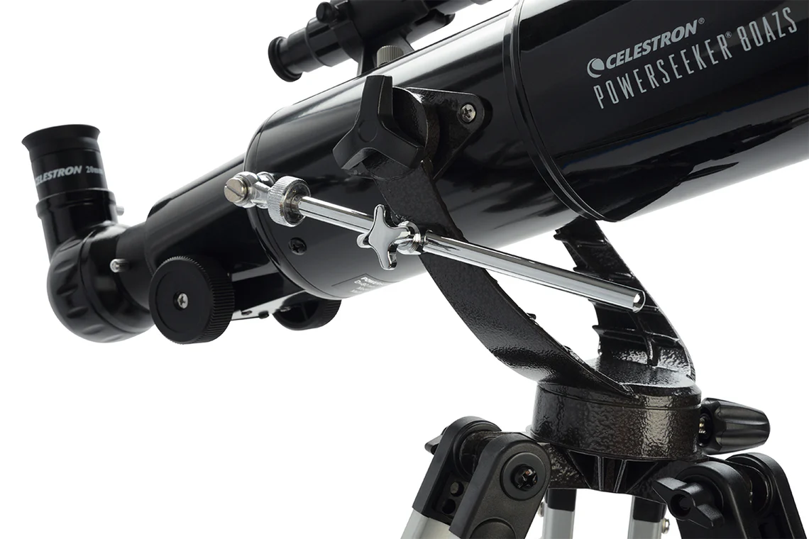 Montar o PowerSeeker 80 é rápido e simples, permitindo-lhe começar a observar em poucos minutos. Mesmo na primeira utilização, a montagem do telescópio e dos acessórios é intuitiva. O tripé ajustável permite personalizar a altura ou colocar o telescópio sobre superfícies elevadas, como uma mesa de piquenique.