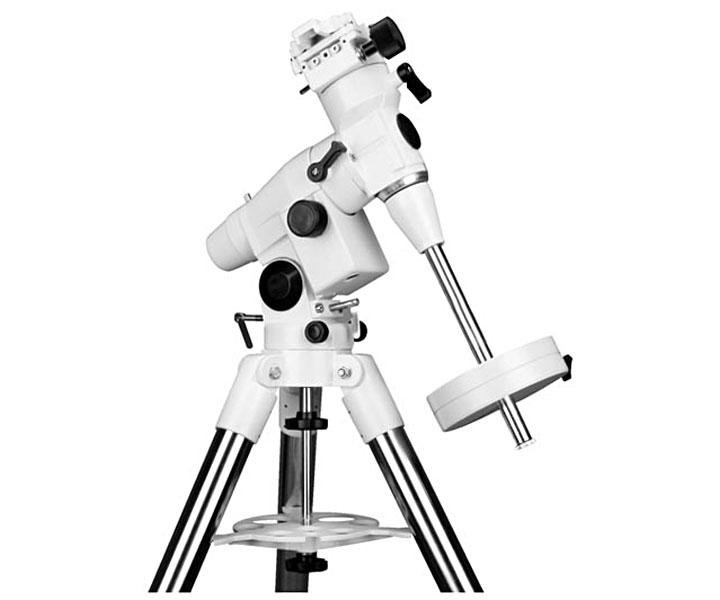 A montagem EQ5 da Skywatcher suporta o tubo Newtoniano com boa estabilidade, sendo perfeitamente adequada para observação visual e astrofotografia de iniciação. Inclui um tripé robusto em aço inoxidável, ajustável até 140 cm de altura.