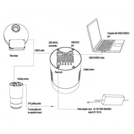 HUB USB 2.0 integrado – ideal para ligar acessórios como ruedas de filtros, câmaras guia, focadores eletrónicos